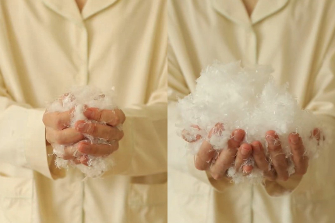 フォスフレイクスは、軽くて丈夫なポリエチレンを極限まで薄く引き伸ばし、羽毛のようにふわふわな状態に加工した素材です。圧縮しても一瞬で元に戻る復元力があり、使い続けてもヘタりにくいのが特長です。