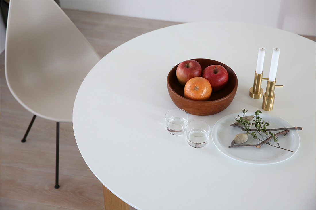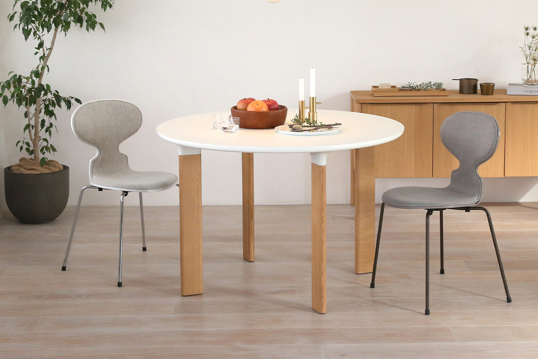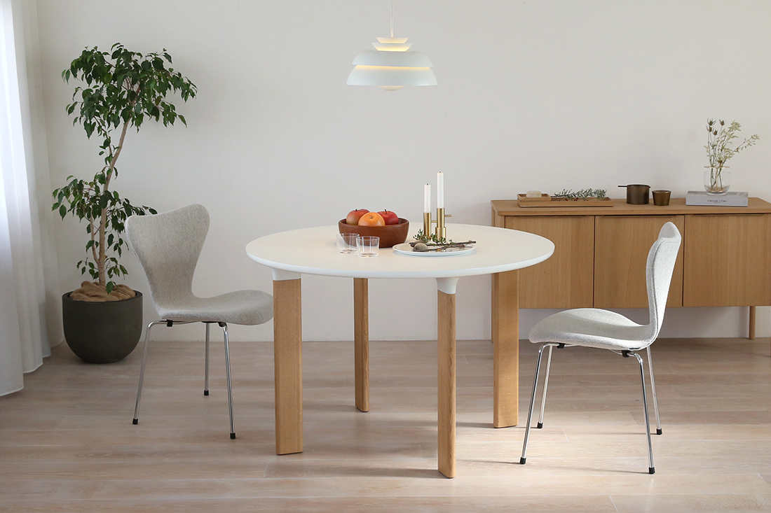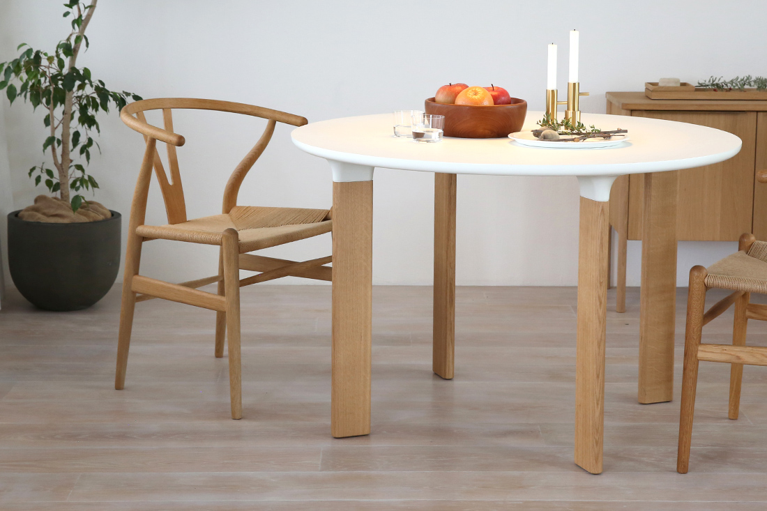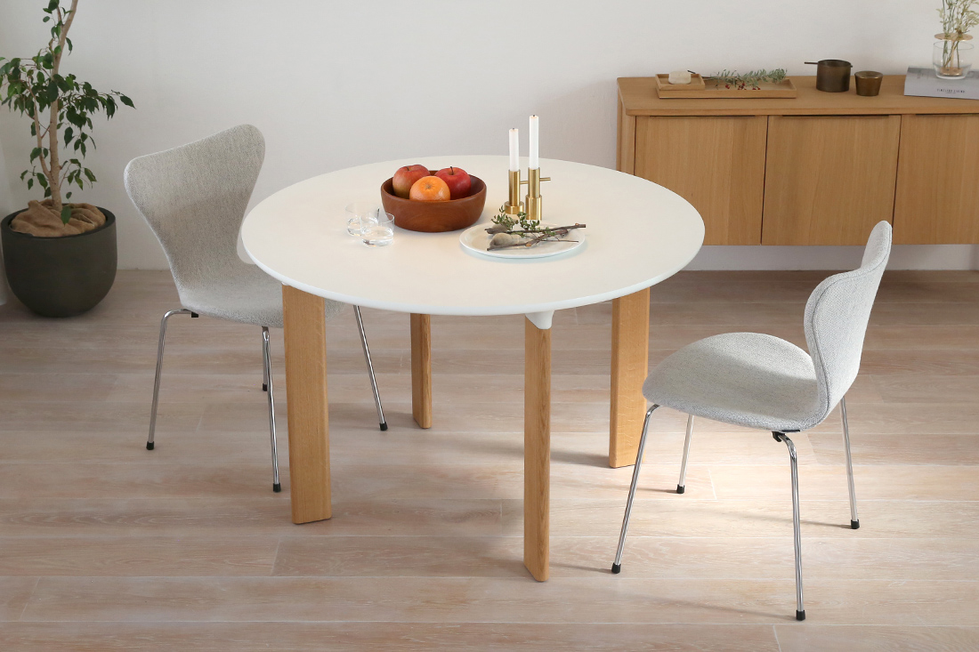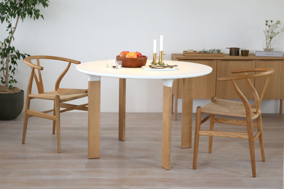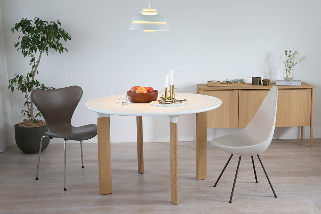 ホワイトラミネートの天板にオーク無垢材の4本脚というシンプルなデザインの「ANALOG JH93」。シンプルだからこそ、卓上に並ぶ食器や花、まわりの家具たちの彩りを、そっと引き立ててくれる、北欧モダンな空間にぴったりの丸テーブルです。