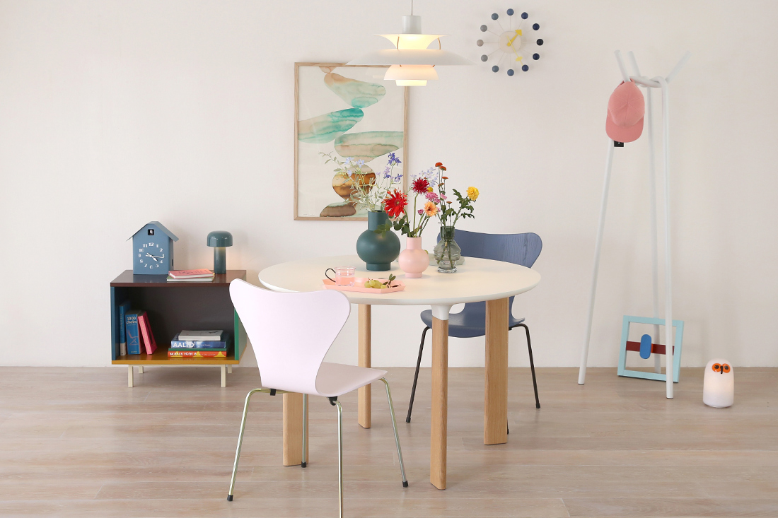 インテリアのスタイリングをするとき、これまではニュートラルな色味の家具や小物と合わせがちでしたが、JH93はカラフルなセブンチェアや小物と組み合わせても、全体的にまとまりがあり、可愛らしすぎない印象に仕上がることに気づきました!