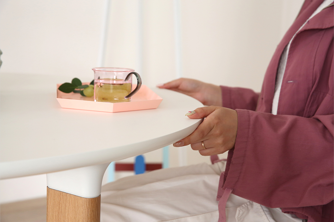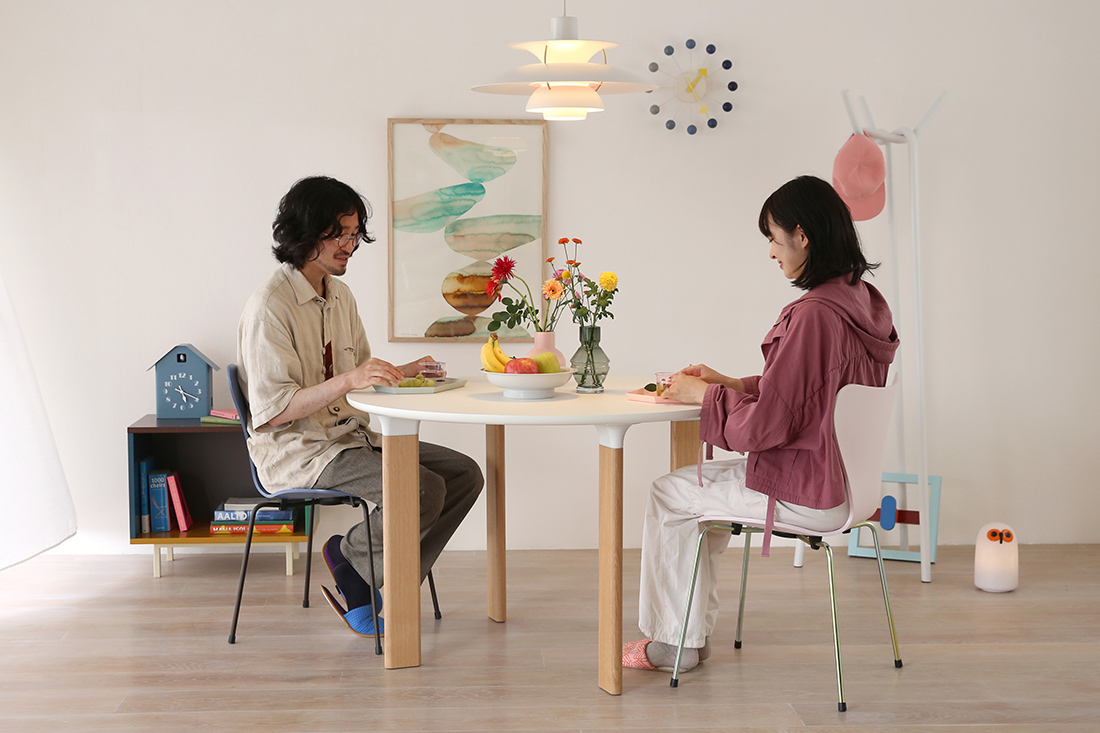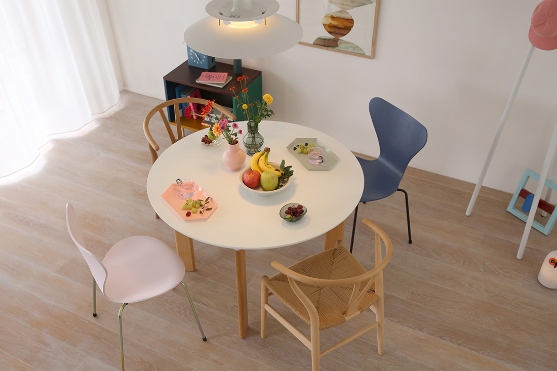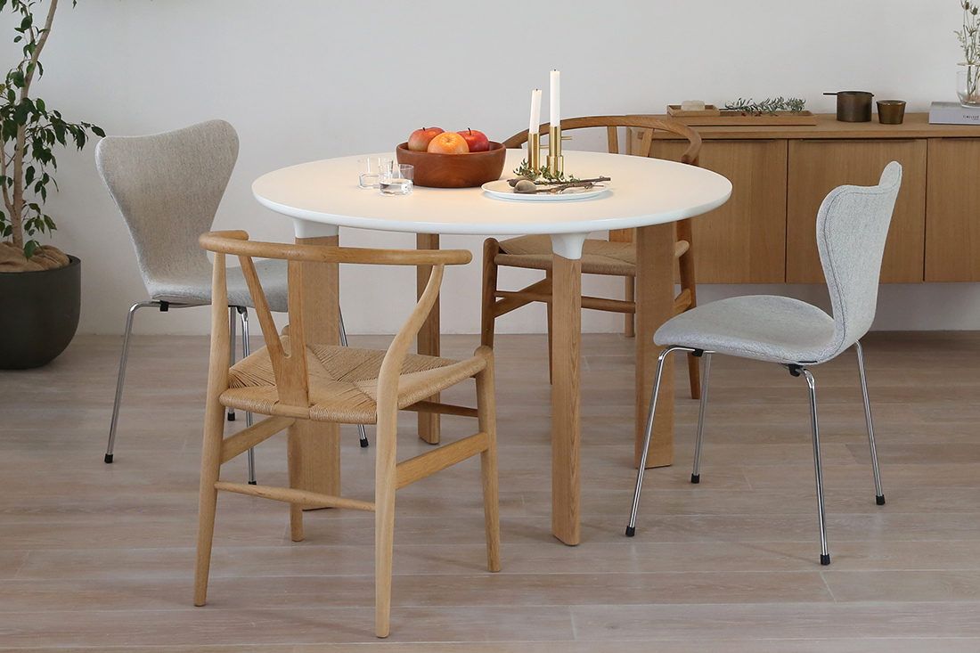 丸テーブルが欲しいけれどどれも同じに見えて迷っていた時に、JH93に出会って「これだ!」となりました。ホワイトラミネート天板とオーク材の脚というどんなスタイルにも合わせられるシンプルさをもちながら、脚が斜めについているところや接着部がトランペットの形になっているところ、天板を横から見た時の丸みのあるフォルムが他にはない可愛さで気に入っています。