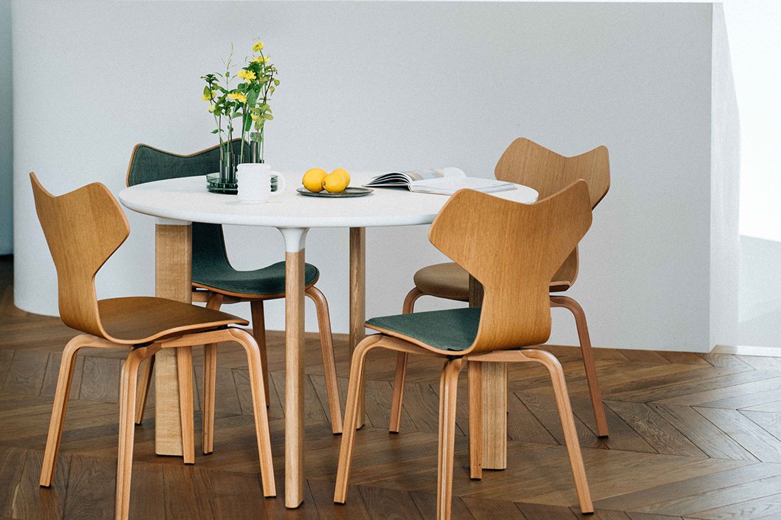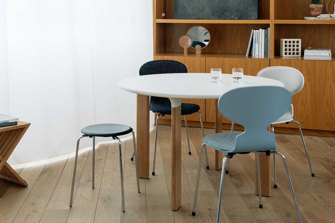 セブンチェアやアントチェア、ドロップチェアといったモダンなデザインのチェアたちとも、見事に調和します。
