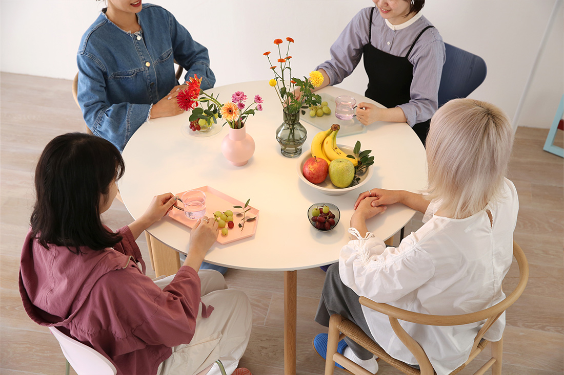 家族と、友人と。丸テーブルを囲んで過ごすひとときは、まさに「ヒュッゲ」—— あたたかく、心がほぐれる北欧流の豊かさです。