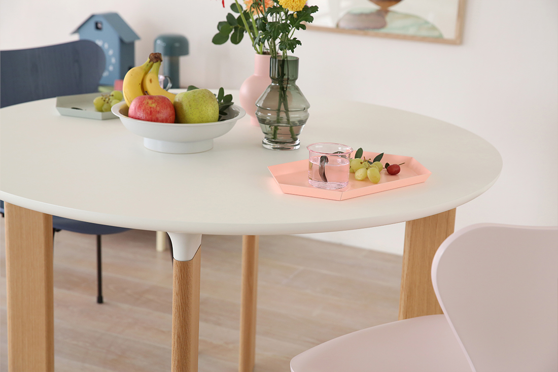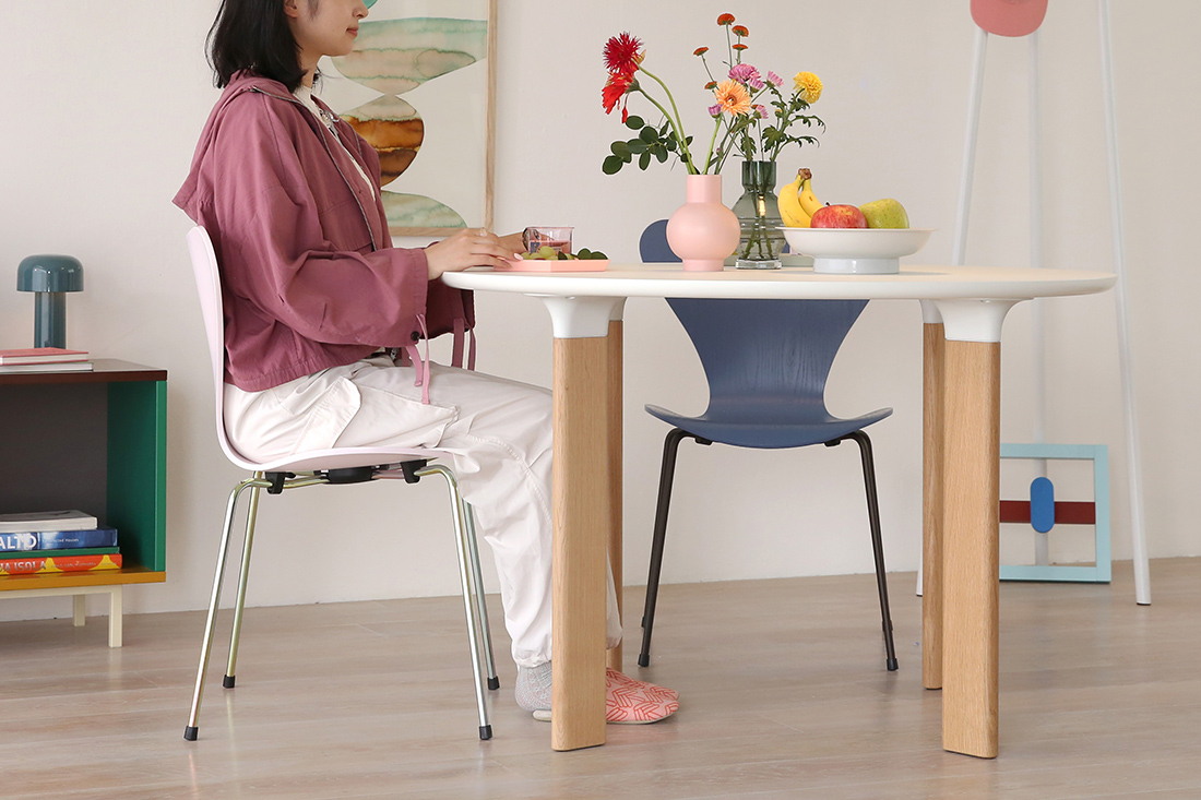 マットでさらりとしたラミネートの白天板と、温かみのあるオーク材の脚の素材感という組み合わせは、カラーコーディネートを楽しむダイニングにぴったり。シンプルなデザインだからこそ、食べ物や食器、周りの家具や雑貨の色を引き立ててくれるんです。