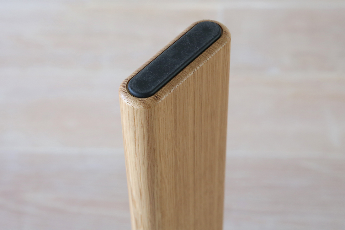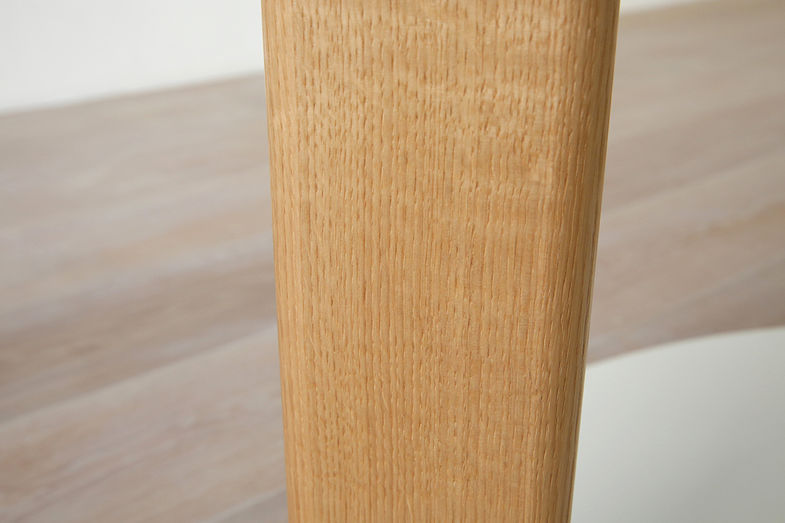 オーク材の脚は平たいバーのような形状で、4本の足がそれぞれ天板の中央に向かって斜めに付いています。