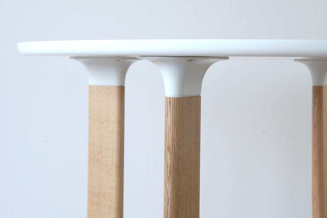天板と同じマットホワイトの塗装が施され、異素材ながら自然に馴染みます。このトランペット形状は、デザインのアクセントとして目を引くだけでなく、天板と脚の接地面を広げることで、脚をしっかりと安定して取り付けられるようにしています。そのおかげで、ぐらつくことなく、安心感のあるしっかりとした強度が保たれているのです。