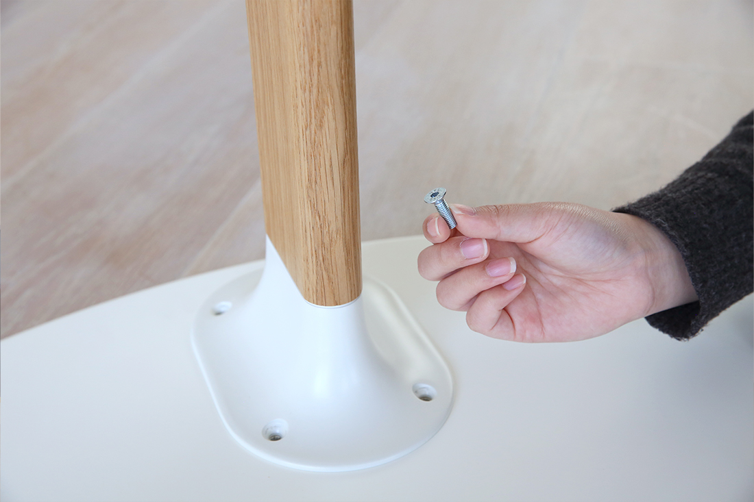 脚に付いたトランペットパーツを、天板裏の穴に合わせてビスで固定するだけ。必要なのは付属の六角レンチのみ。ひとりでも10分程度で完成できます(起こすときだけ、誰かに少し手伝ってもらえたら安心)。