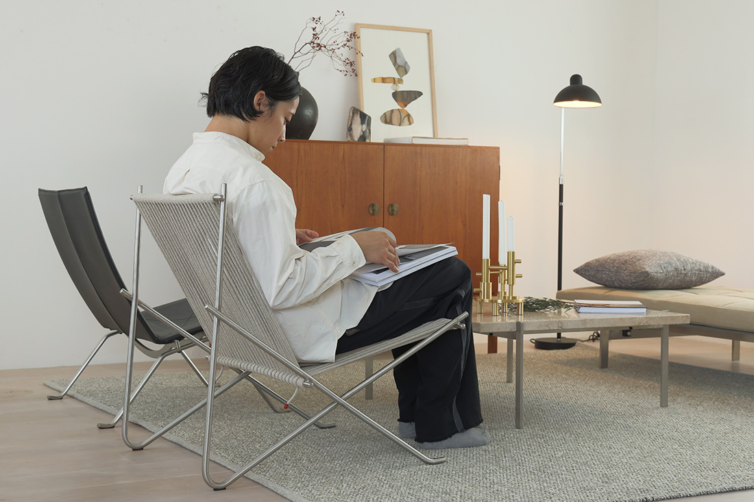 モダンでリラックス感あふれるPK4は、ミニマルな表現で素材の魅力を最大限に生かすケアホルムの美学をスッと生活の中に溶け込ませ、より身近に感じさせてくれる一脚です。
