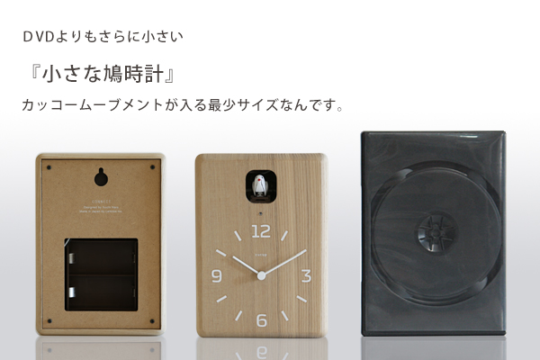 小さい鳩時計がつくりたくて、使用している鳩時計のムーブメントが入るぎりぎりのサイズでデザインしました。後は直方体のボリュームのバランスをみながらサイズを決定しました。白い余白のある壁にぽつんと掛けてもらえたらかわいいかと思います。子供部屋でもいいですし、リビングなどの共有空間において頂いても雰囲気が和む気がいたします。
