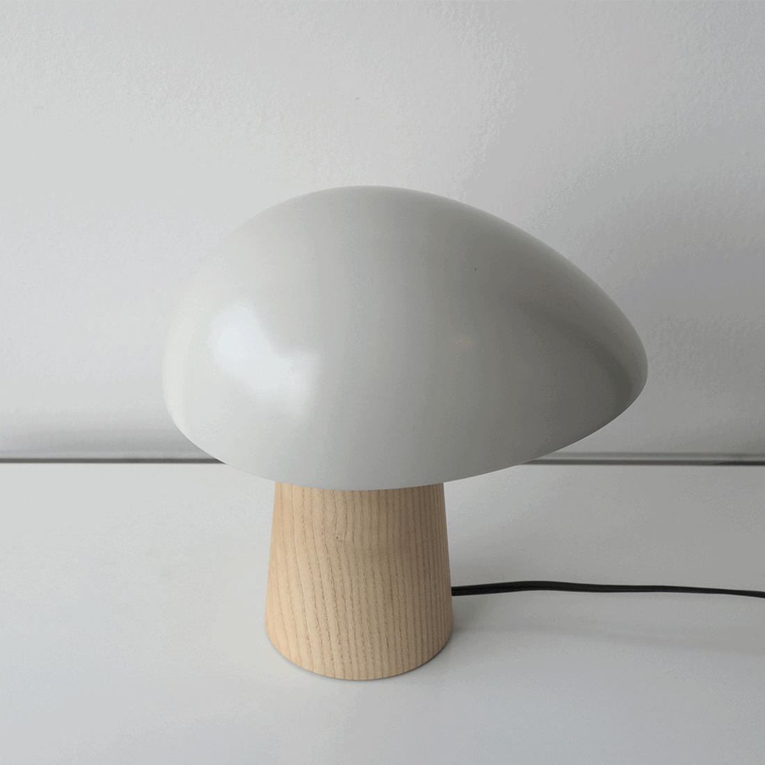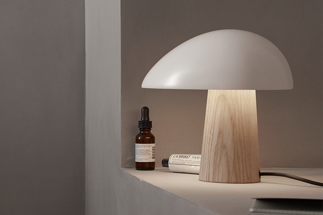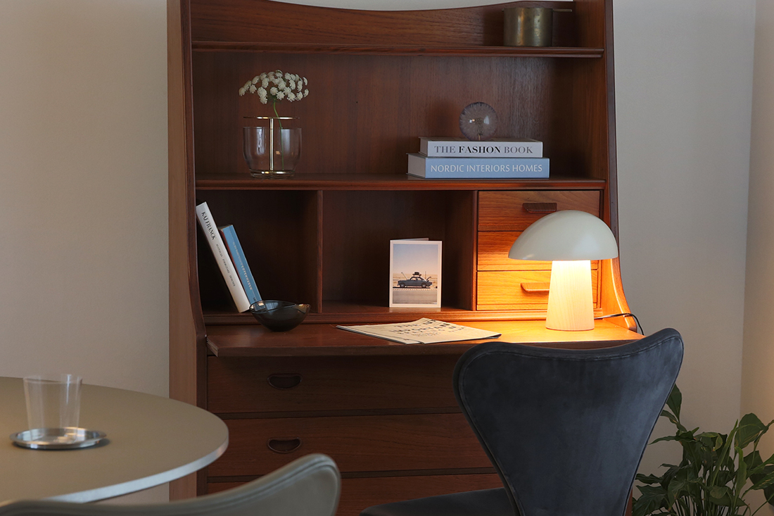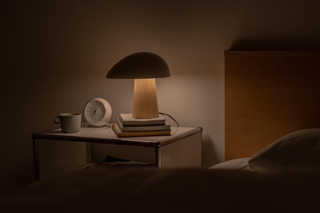 アッシュの部分が無垢材で出来ており、シェードもマットな仕上げなことから、北欧インテリアの魅力である素材感を感じることができ、無機質な場所でもナイト・オウルを置くと有機的なフォルムとアッシュ(無垢)の部分が程よく中和してくれます。