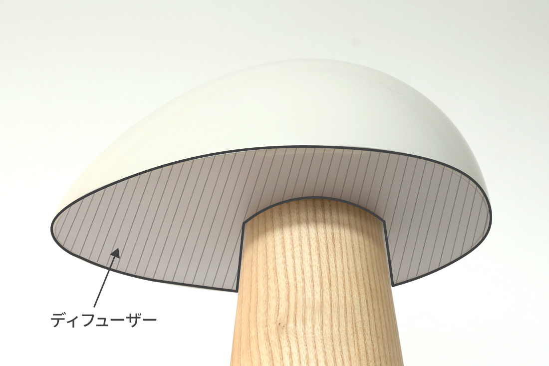 シェードにはグレア(不快な眩しさ)が発生しないよう下の部分全体にディフューザーが付いています。このディフューザーは、ポリカ―ボネートを使用しており、耐久性が高いため壊れにくく、表面に細かい凹凸を施していることにより柔らかい光が反射されます。