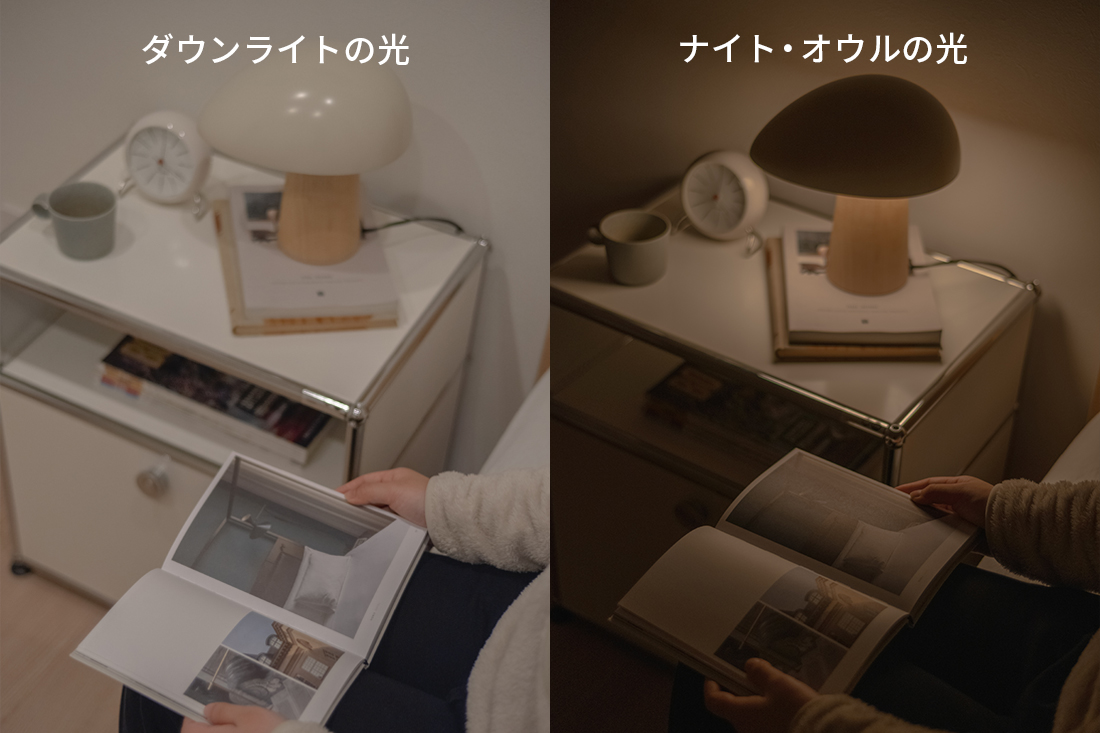 一日の最後は、ダウンライトなどを全部消して、ナイト・オウルの光だけで過ごしてみてはいかがでしょうか。天井からの照明を消すことによって、絵本に集中することができ、ゆったりとした時間を過ごしていただけます。