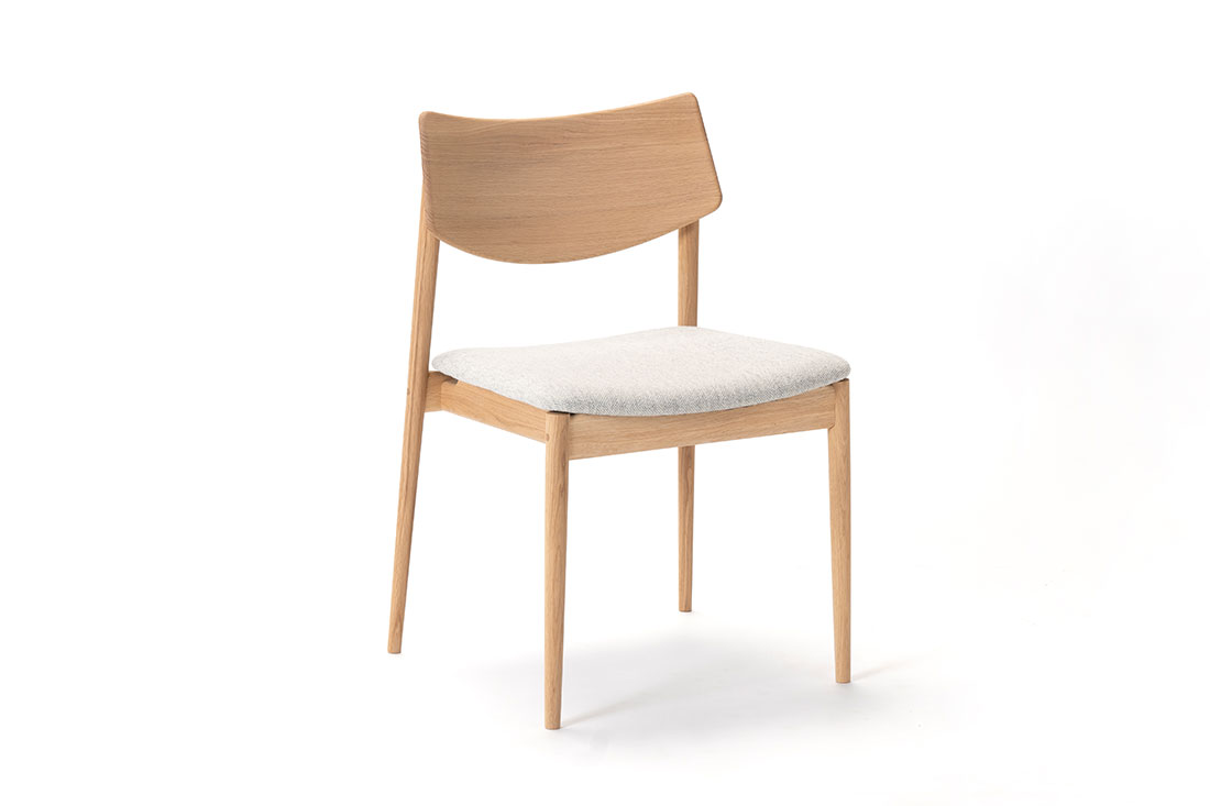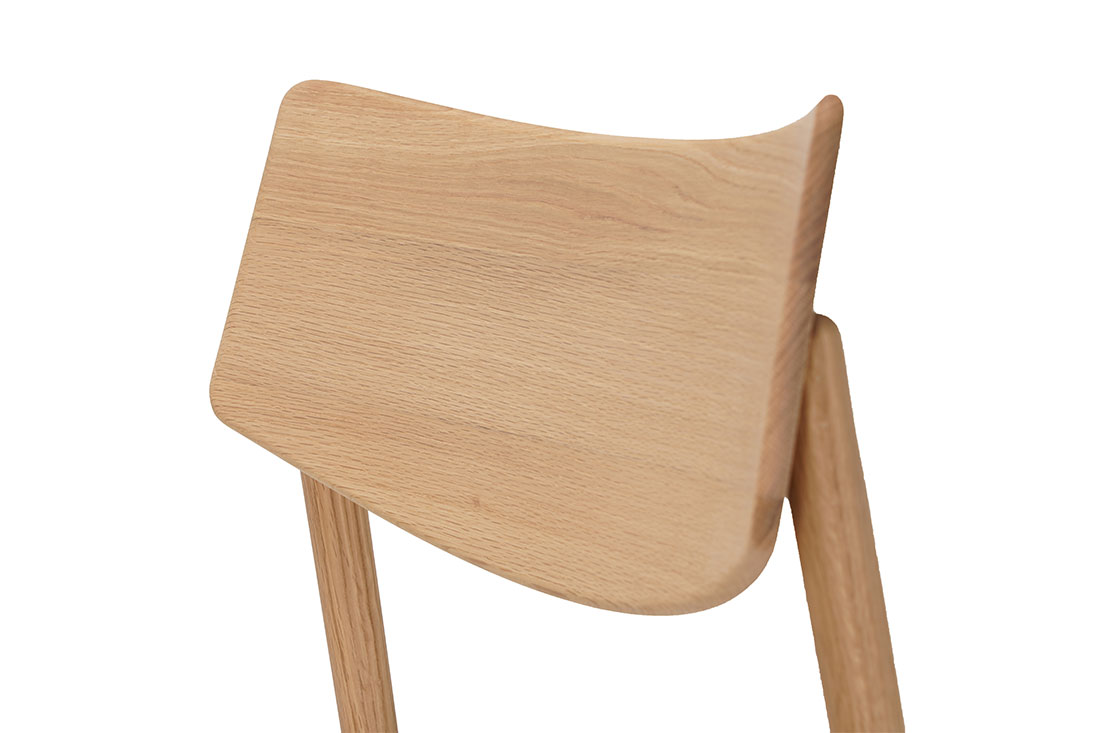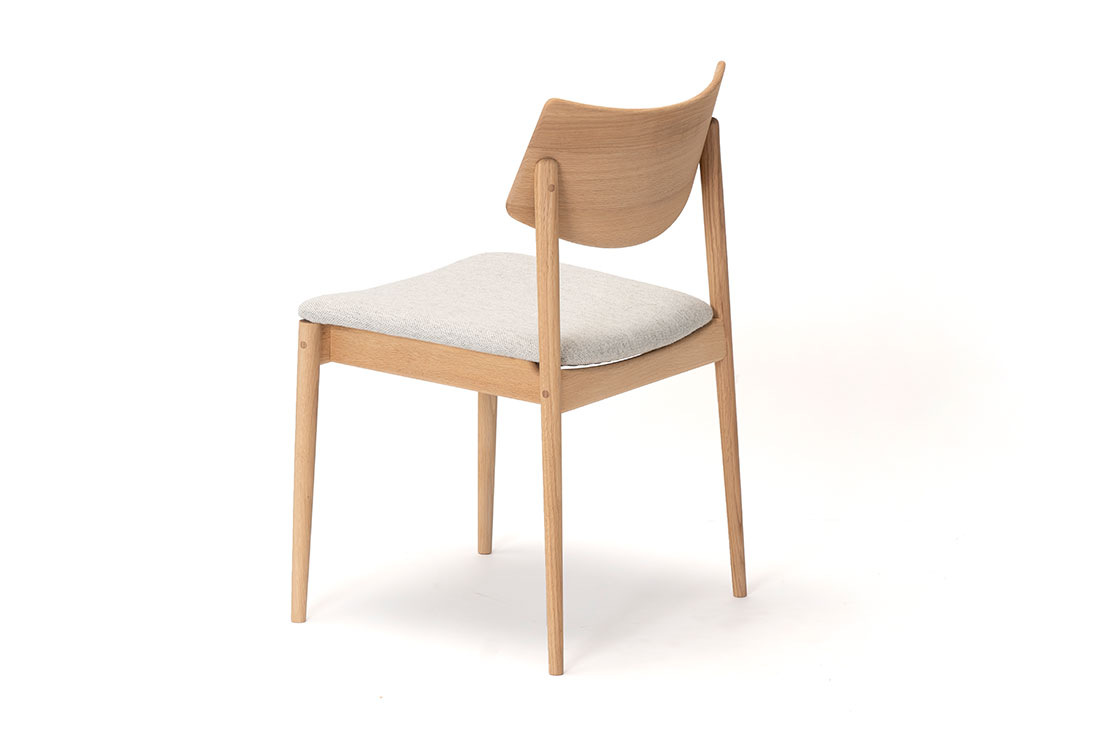 背もたれはやわらかな曲線で体をしっかりと支え、座面はしっかり厚みがありながらも軽やかな印象に。アームレスタイプのため、テーブル下にもすっきり収まり、動線も確保できます。