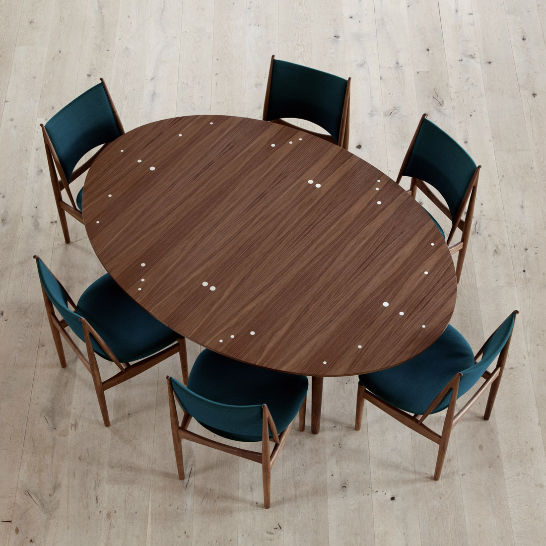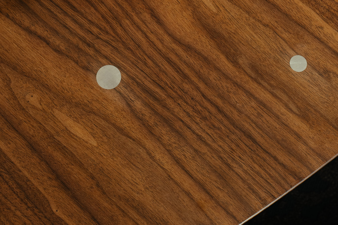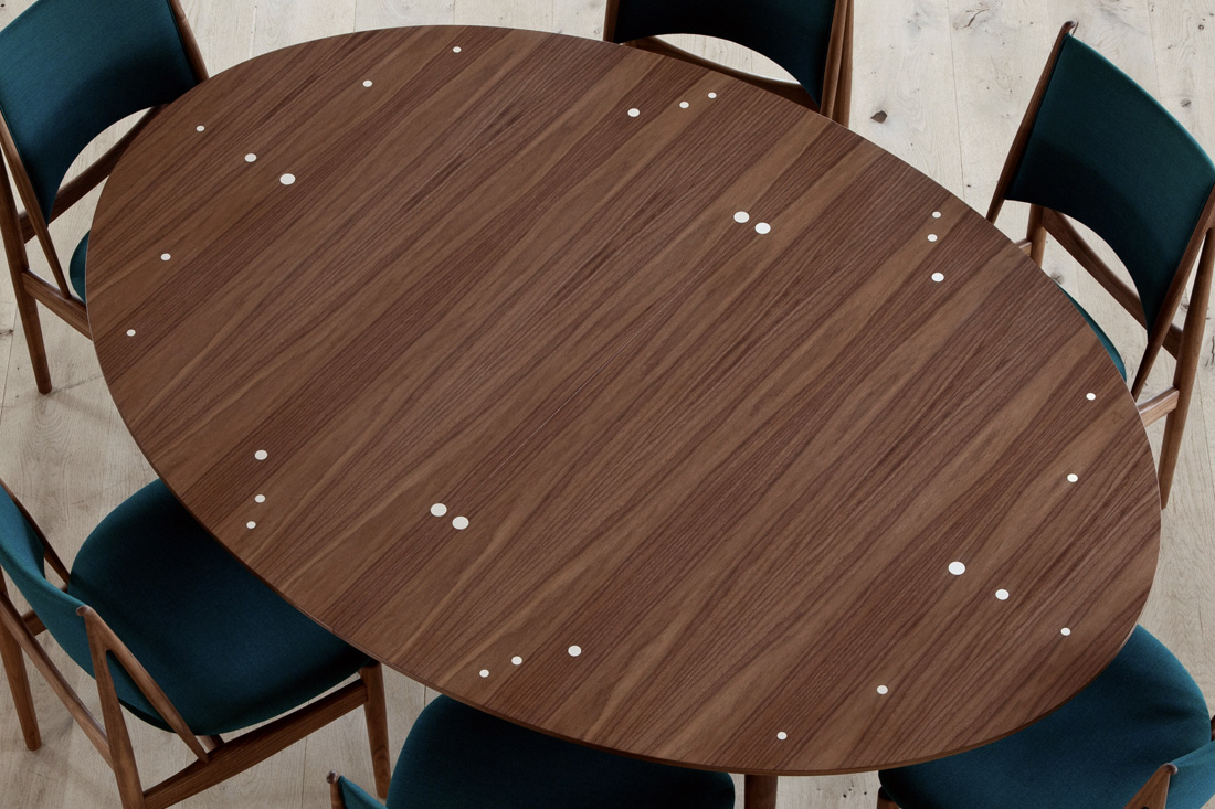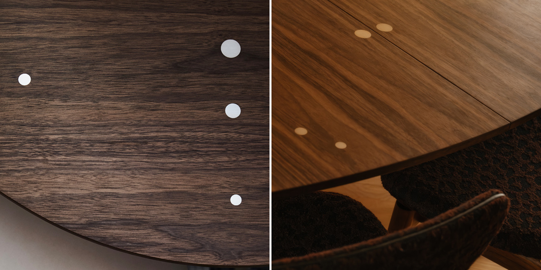 大きなダイニングテーブルは、少人数で囲むとどこか手持ち無沙汰に感じてしまうもの。天板に散りばめられた30個のスターリングシルバーが着座位置の目印となり、人数を問わず自然と心地よい距離感へと導きます。