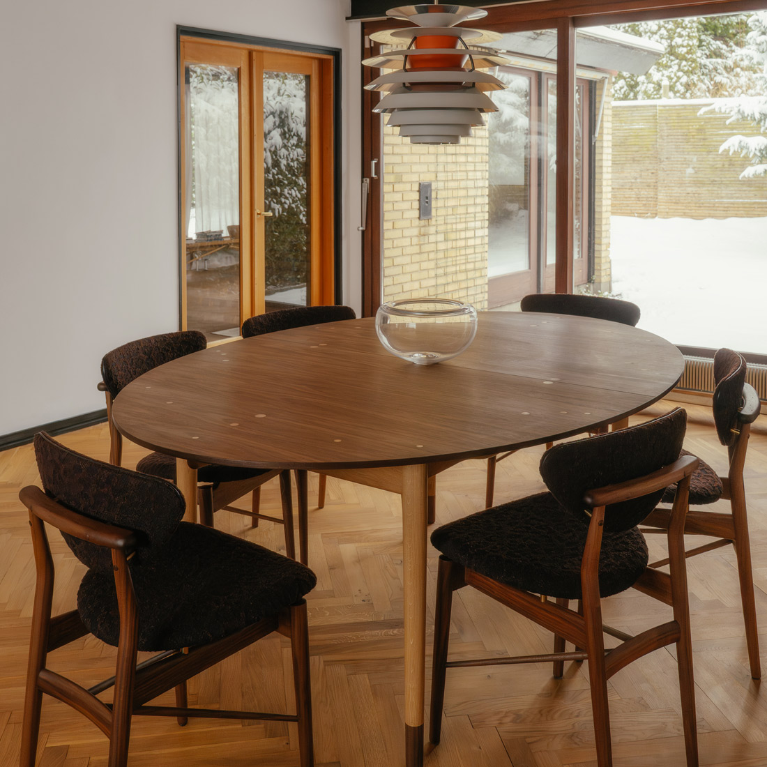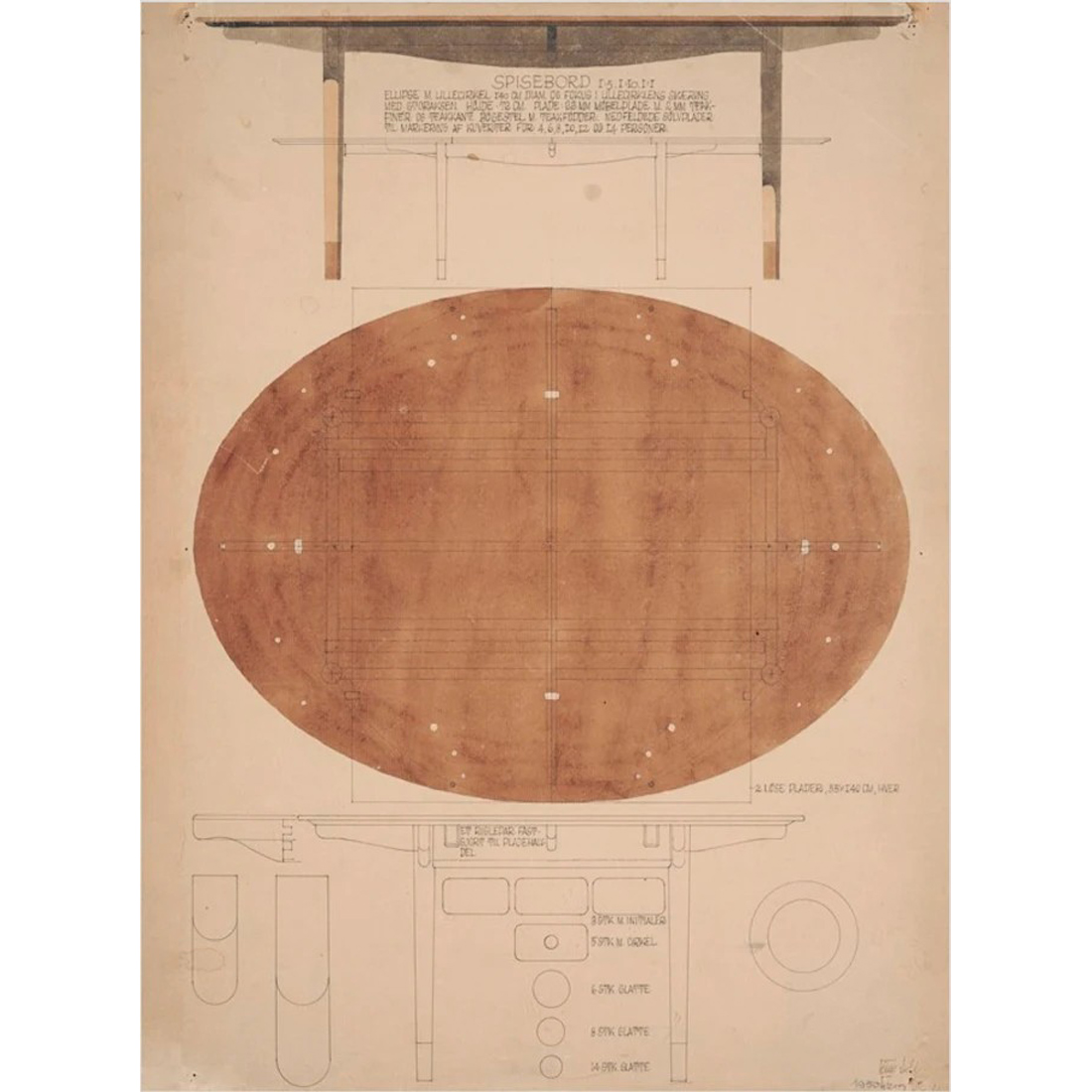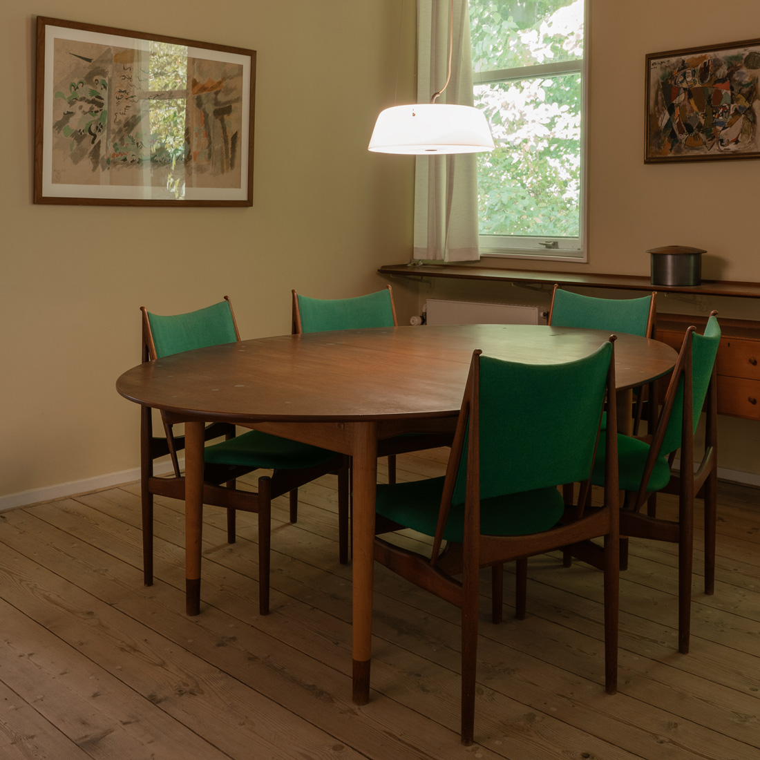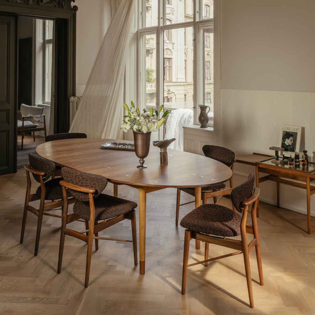 発表当時、天板に美しく埋め込まれた30個の純銀の装飾は、人々に聖書の逸話(ユダの30枚の銀貨)を連想させ、「ユダのテーブル」という愛称が定着するほど鮮烈な印象を与えました。フィン・ユール自身もオードロップ(デンマークの首都コペンハーゲンの北部)の自邸にて、本来セットではないエジプシャンチェアと合わせてこのテーブルを愛用。作り手自身がその美しい調和を楽しんでいた、特別な名作です。