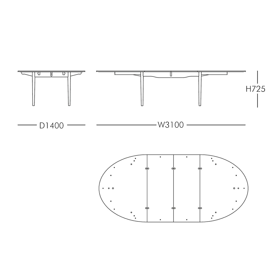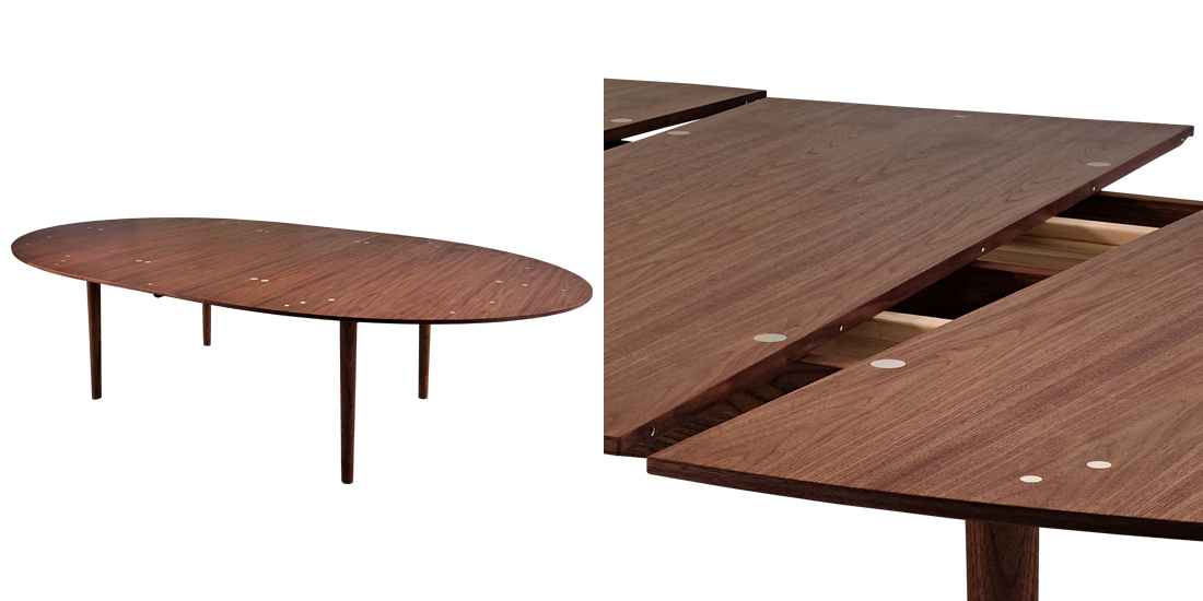テーブルを広げる際、脚(フレーム)の位置が固定されたまま、天板のみが拡張する安定した構造を採用。付属の拡張天板(エクステンションリーブス)を2枚追加しても、優美なプロポーションを一切崩しません。