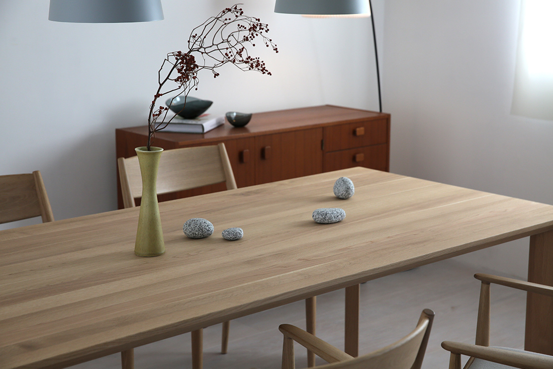 過剰な主張をせず、素材への誠実さと緻密なディテールで作られた「A-DT02」は、お気に入りの椅子や照明、そしてお料理が並んだとき、空間全体を一つの美しい風景に整えてくれます。