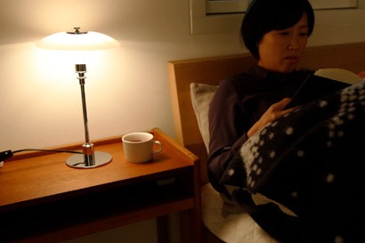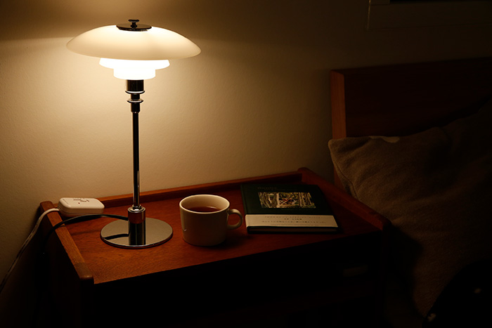 明るい照明をつける・消すだけのON・OFFの暮らしでは、布団にはいってからすぐに寝付けないので、気持ちをリラックスさせるためにも、スタンドの低い位置からの灯りで、静かな時間を過ごすようにしています。