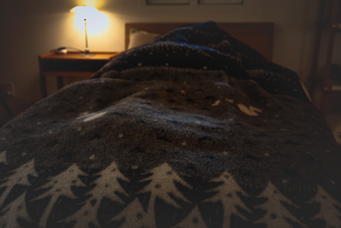 羽毛布団の上からブランケットをかけた方があたたまるそうです。上にかけるブランケットも、KLIPPAN×mina perhonenなら可愛いくて、ベッドカバーとしても最適です。しかもウール100%なのでとてもあったか!